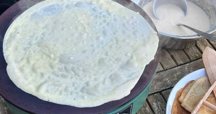 - Das Crêpe-Eisen / die Pfanne ölen und stark (200 – 220°C) erhitzen und schnell eine Schöpfkelle Teig in die Mitte geben. Mit einem Crêpe-Verteiler den Teig gleichmäßig über die ganze Fläche verteilen.