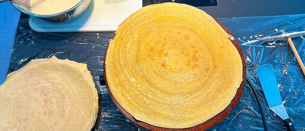 - Fertigen Crêpe auf den Teller legen und mit der Folie bedecken.