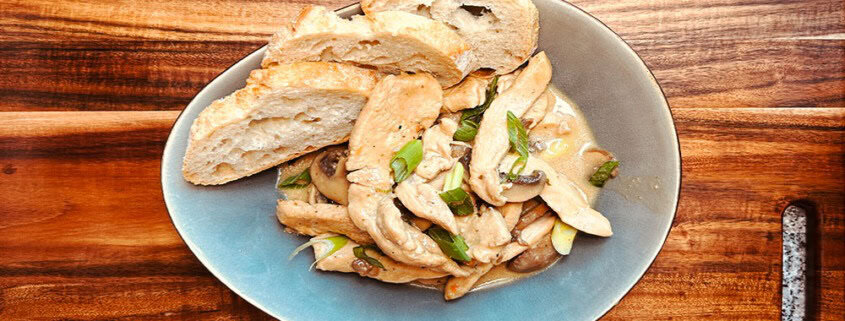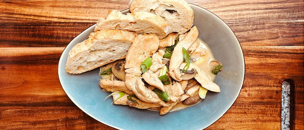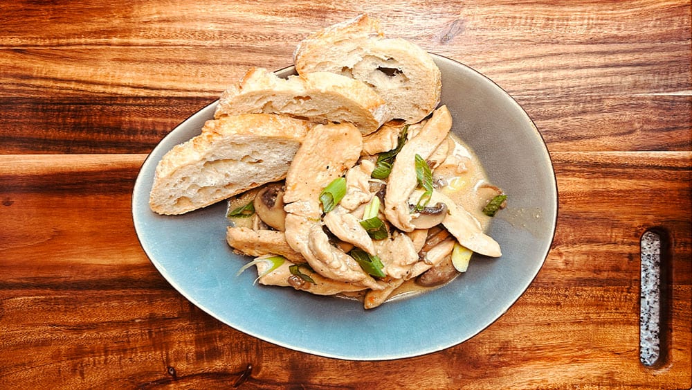 Das Geschnetzelte auf Tellern anrichten. Dazu passen Baguette oder Nudeln besonders gut.