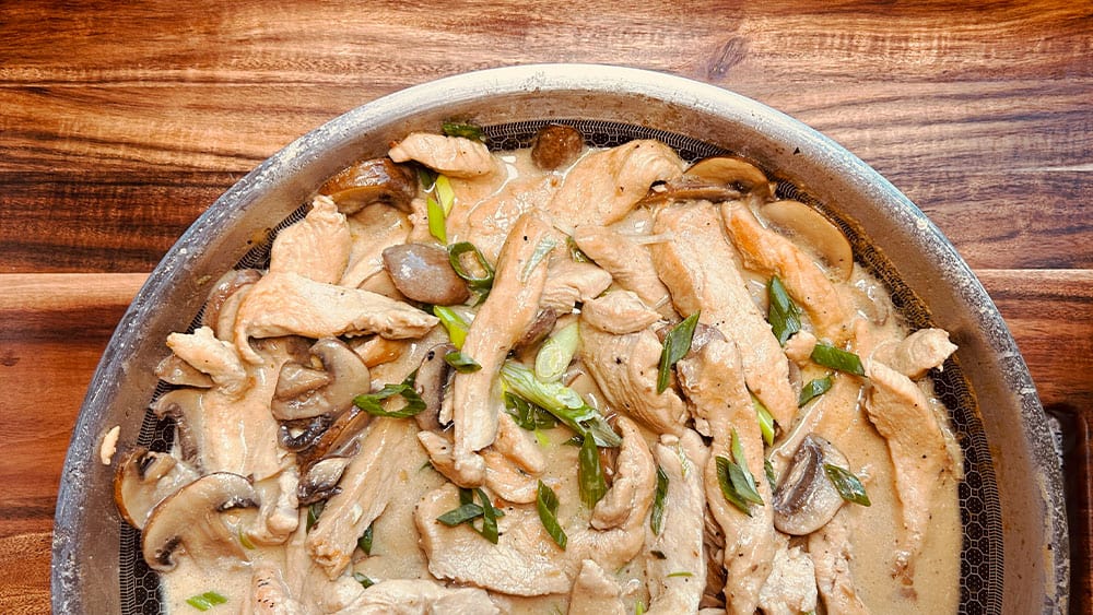 Die Champignons im verbliebenen Bratfett andünsten. 1 – 2 EL Wochestersauce einrühren und nachdem etwas verdunstet ist, mit Weißwein und Brühe ablöschen und einmal aufkochen lassen. Das angebratene Fleisch wieder in die Pfanne geben und etwa 5 Minuten köcheln lassen. Anschließend die Sahne zugießen und weitere 3–4 Minuten leicht köcheln. - Verfeinern