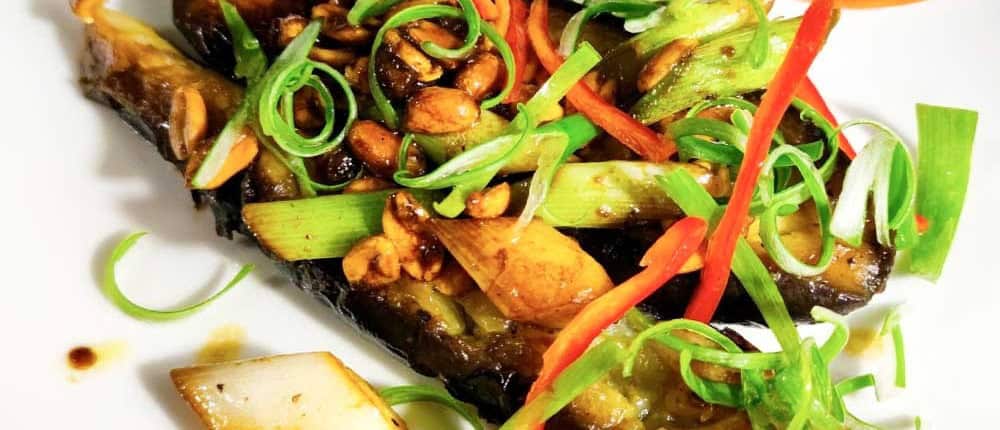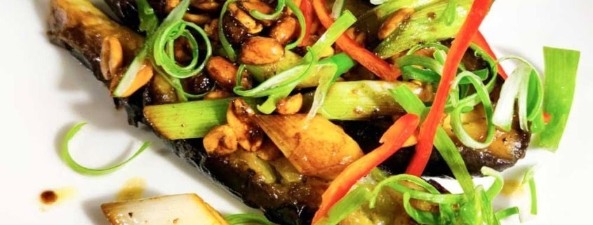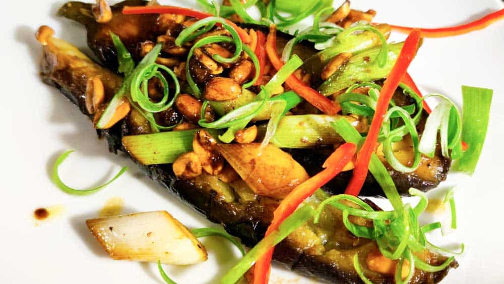 - Die Auberginenhälften wenden. Die Pfanne schwenken, bis die Auberginen nach ein paar Minuten mit der Sauce überzogen sind.
