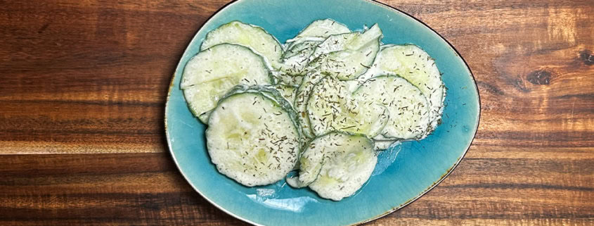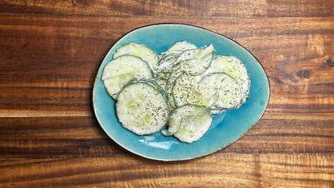 - Gurke waschen, fein hobeln und mit Dressing mischen.