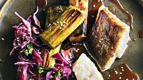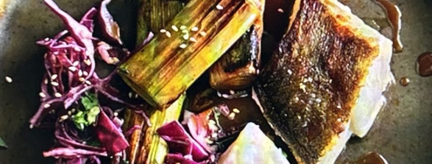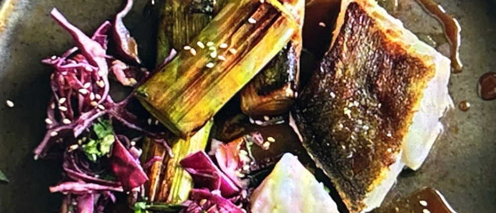 - Kabeljau auf dem Miso-Lauchbett anrichten und mit Frühlingszwiebeln sowie Sesam bestreuen.