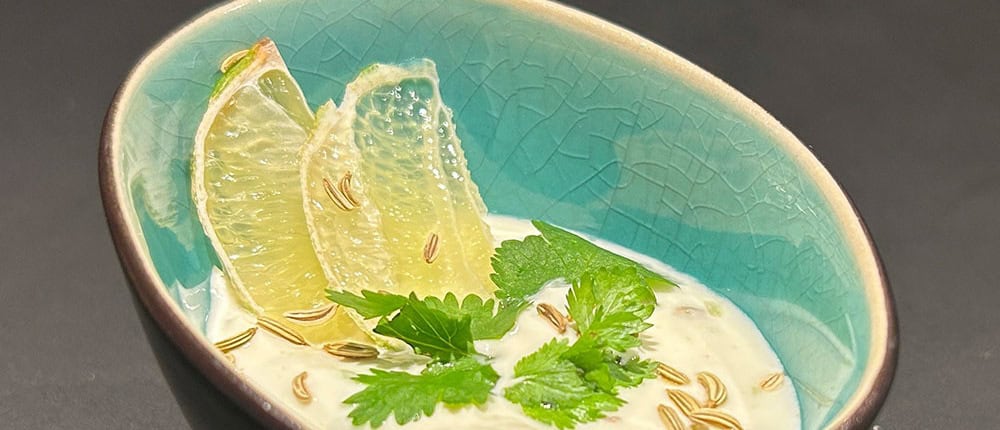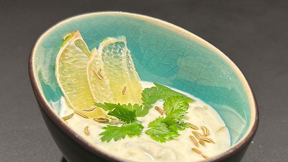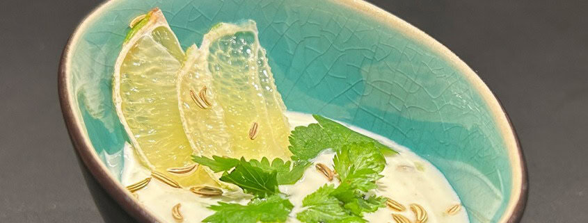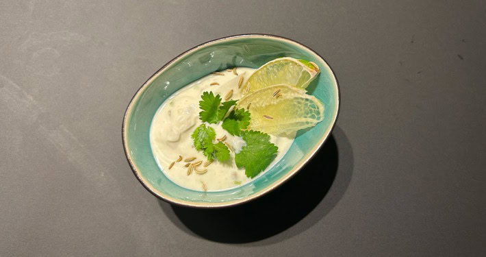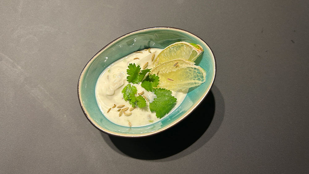 - In einer Schüssel den Joghurt mit den Kreuzkümmelsamen, der Limettenschale und 1 Prise Salz verrühren.