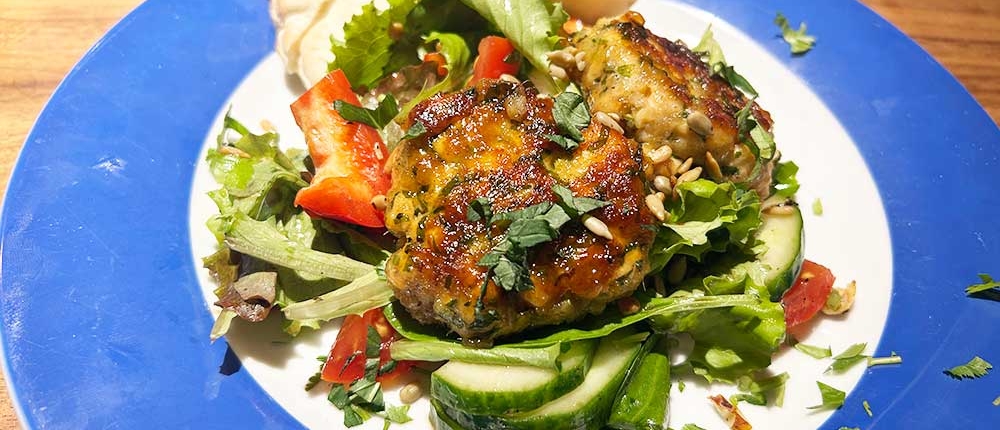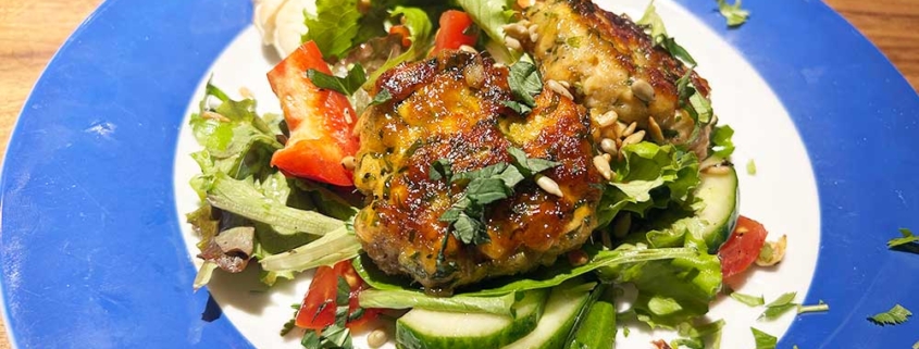 Aus der Masse 4 Frikadellen formen, etwa 2 cm dick. In einer großen beschichteten Pfanne 1 EL Olivenöl bei mittlerer bis hoher Hitze erhitzen. Die Frikadellen darin von beiden Seiten je ca. 2 Minuten goldbraun braten. - Mit Chili-Konfitüre verfeinern