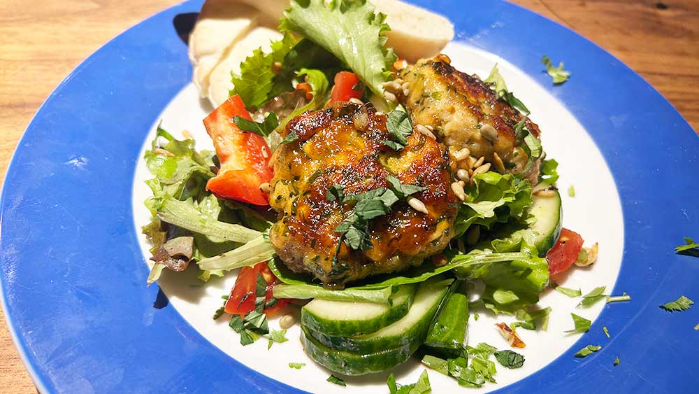 Die Frikadellen auf einer Servierplatte anrichten. Mit den abgetropften Korianderblättern garnieren und mit ein paar Tropfen hochwertigem Olivenöl verfeinern.