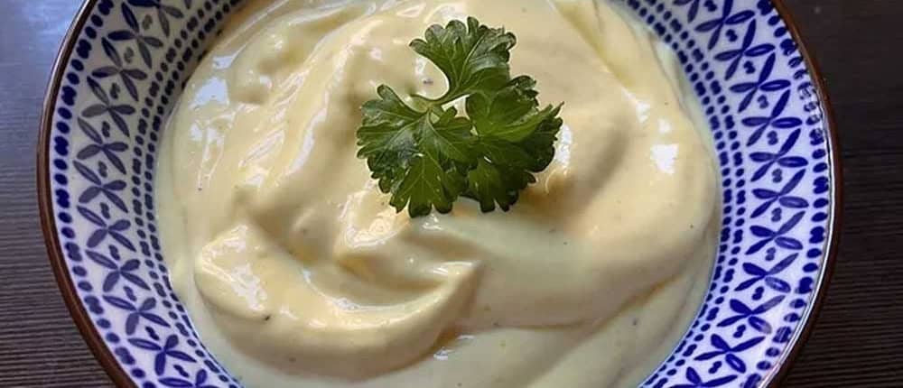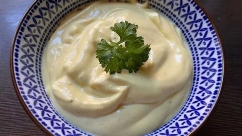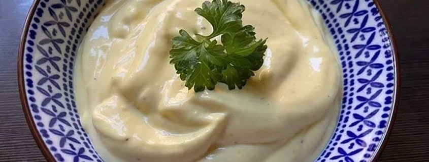 Das gesamte Öl zugeben und dann den Pürierstab unten im Mixbecher solange pürieren, bis die Mayonnaise eine cremige Konsistenz hat.