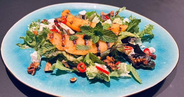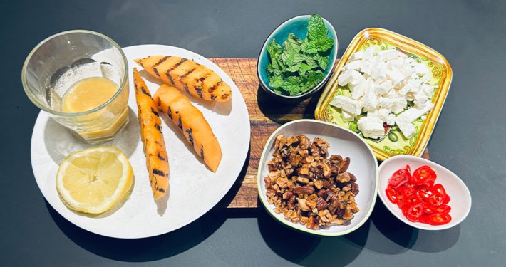 Alle Zutaten für das Dressing mit einem Milchschämer gut vermengen oder shaken. Mit Salz und Pfeffer abschmecken. - Melone grillen