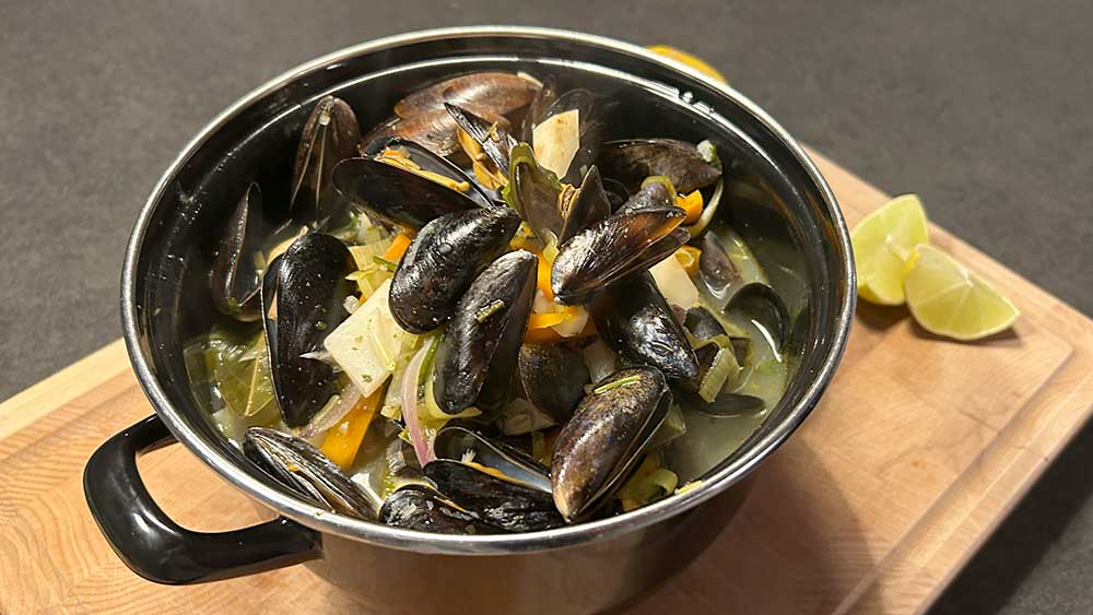 - 600 g Miesmuscheln, abgebürstet und entbartet