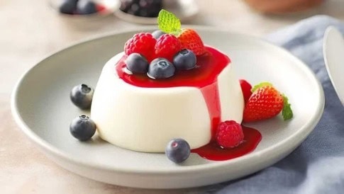 - Panna cotta aus den Förmchen stürzen (mit warmem Messer ringsherum schneiden oder das Förmchen kurz in heißes Wasser halten, falls es nicht klappen sollte). Panna cotta mit dem Beerenkompott garnieren.