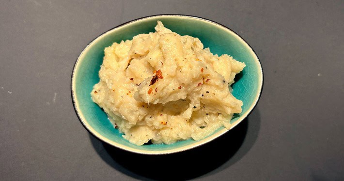 - Mit heißer Milch und Butter cremig rühren, mit Salz und Muskat abschmecken. Warmstellen.
