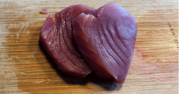 - Die Thunfisch-Steaks halbieren, so dass man den rosa Kern und den knusprigen Rand schön sieht.