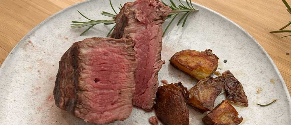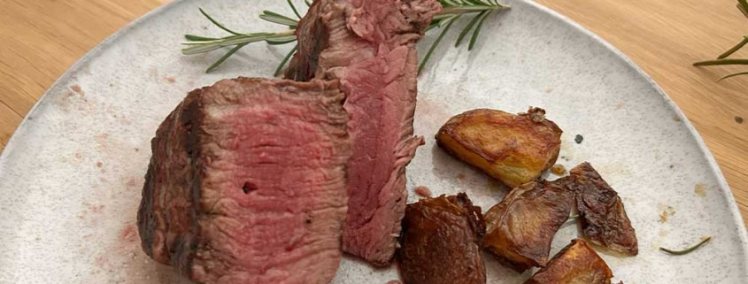 - Das Rinderfilet in gleichmäßige Scheiben schneiden und mit Salz und Pfeffer würzen.