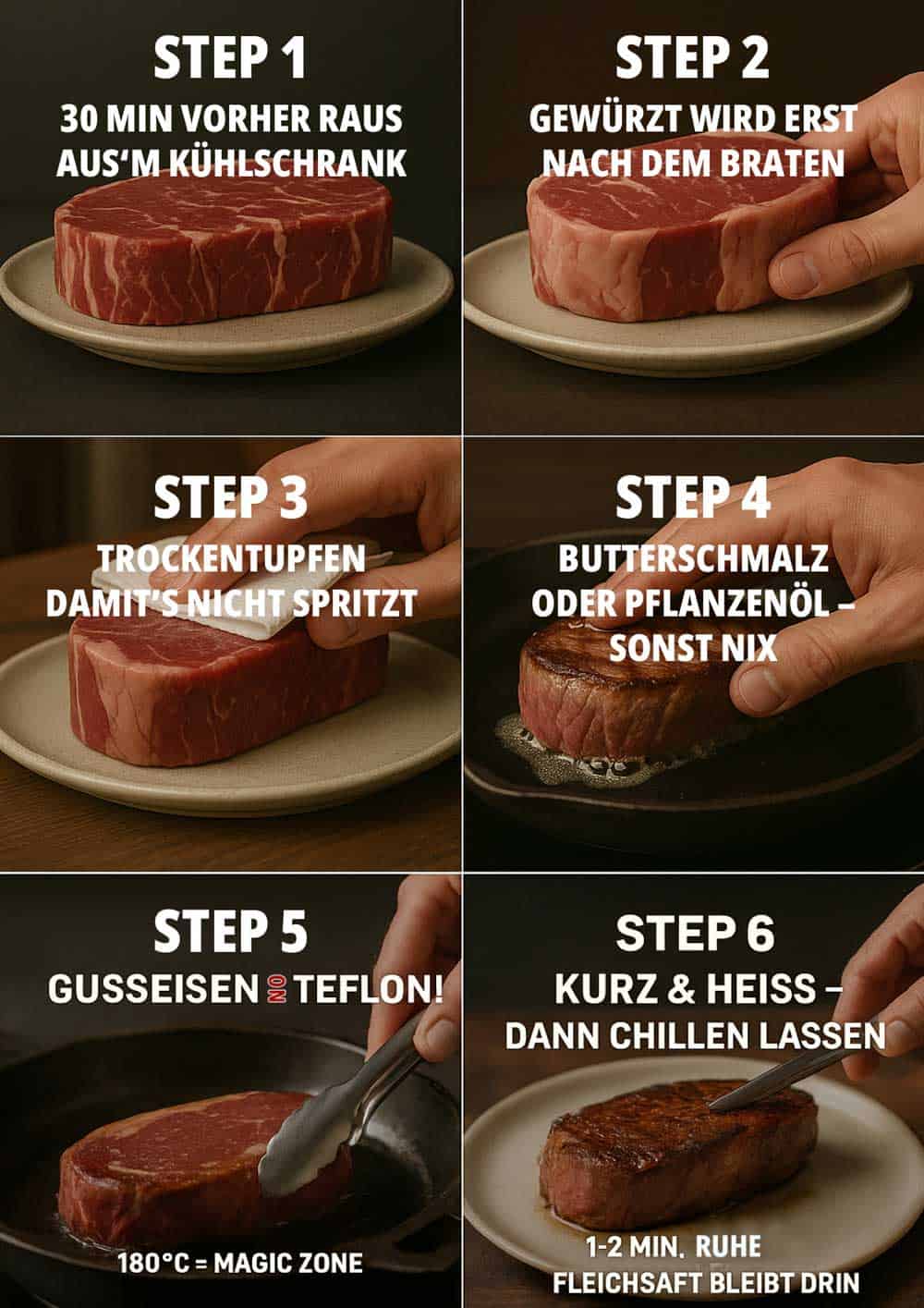 - Wichtig: Maximal zwei Steaks gleichzeitig braten – sonst kühlt die Pfanne ab und das wars mit der Kruste.