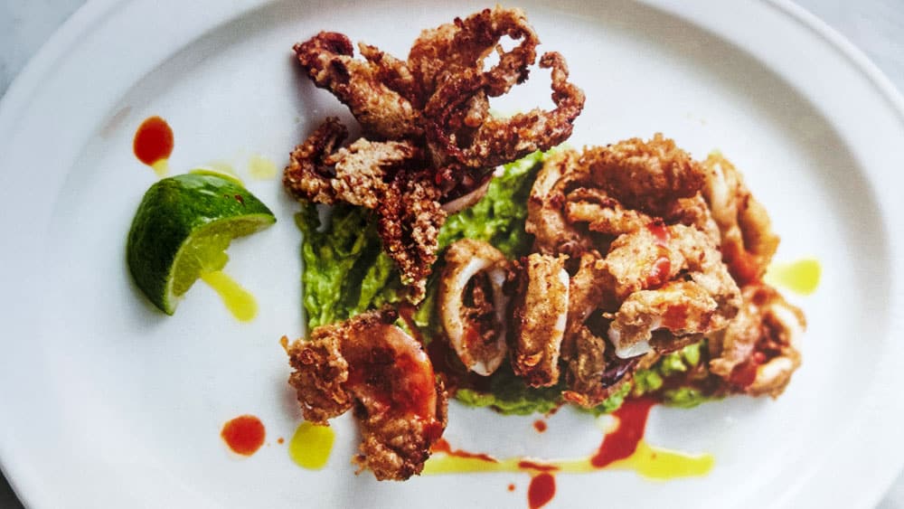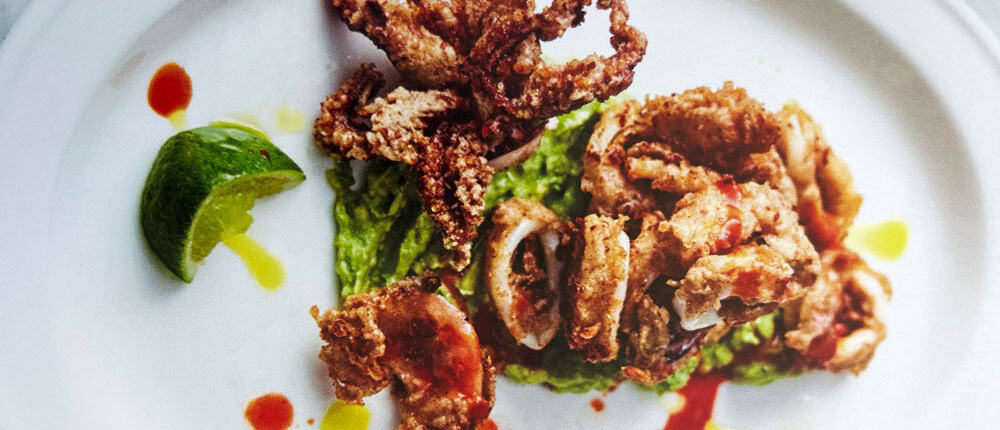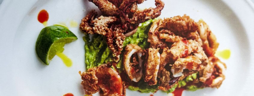 Die knusprigen Tintenfischringe auf dem Avocadomus anrichten.