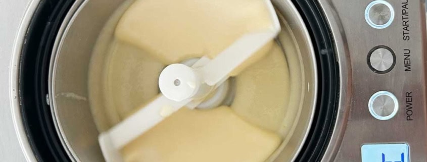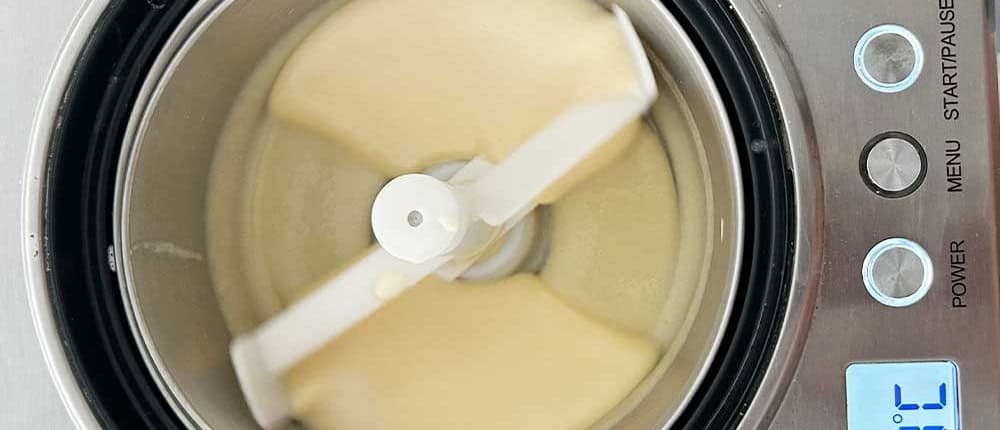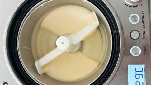 - Auf Zimmertemperatur (besser noch: auf Kühlschranktemperatur) runterkühlen lassen und dann in die Eismaschine geben.