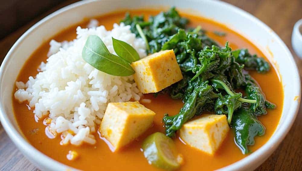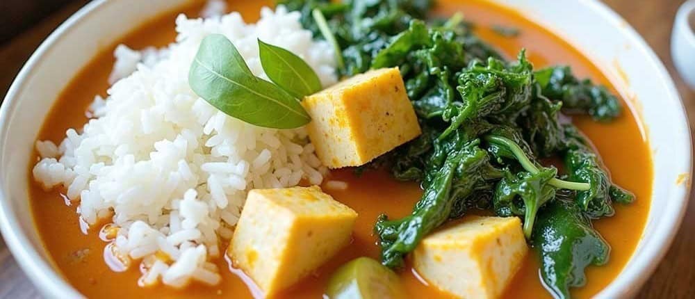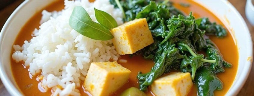 - Das Curry in Schalen verteilen, Reis, Tofuwürfel und Blattspinat dazugeben, mit frischen Kräutern (Thai-Basilikum, Koriander) garnieren.