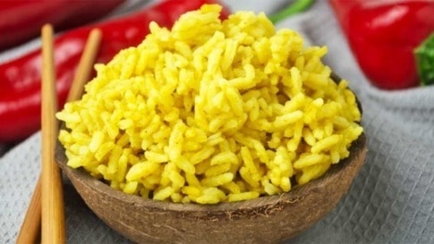 - Öl in einem Topf erhitzen. Reis hinzugeben und rühren bis alle Reiskörner mit Öl fettig sind. Kurkuma hinzufügen.