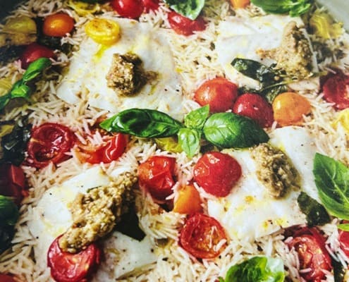 Mediterrane Fischpfanne mit Tapenade-Reis und Tomaten